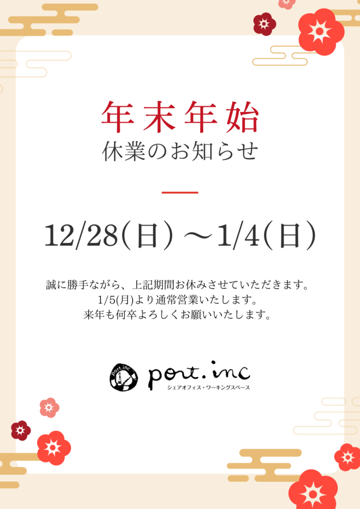 ポートインクの年末年始休日は、下記日程とさせていただきます。